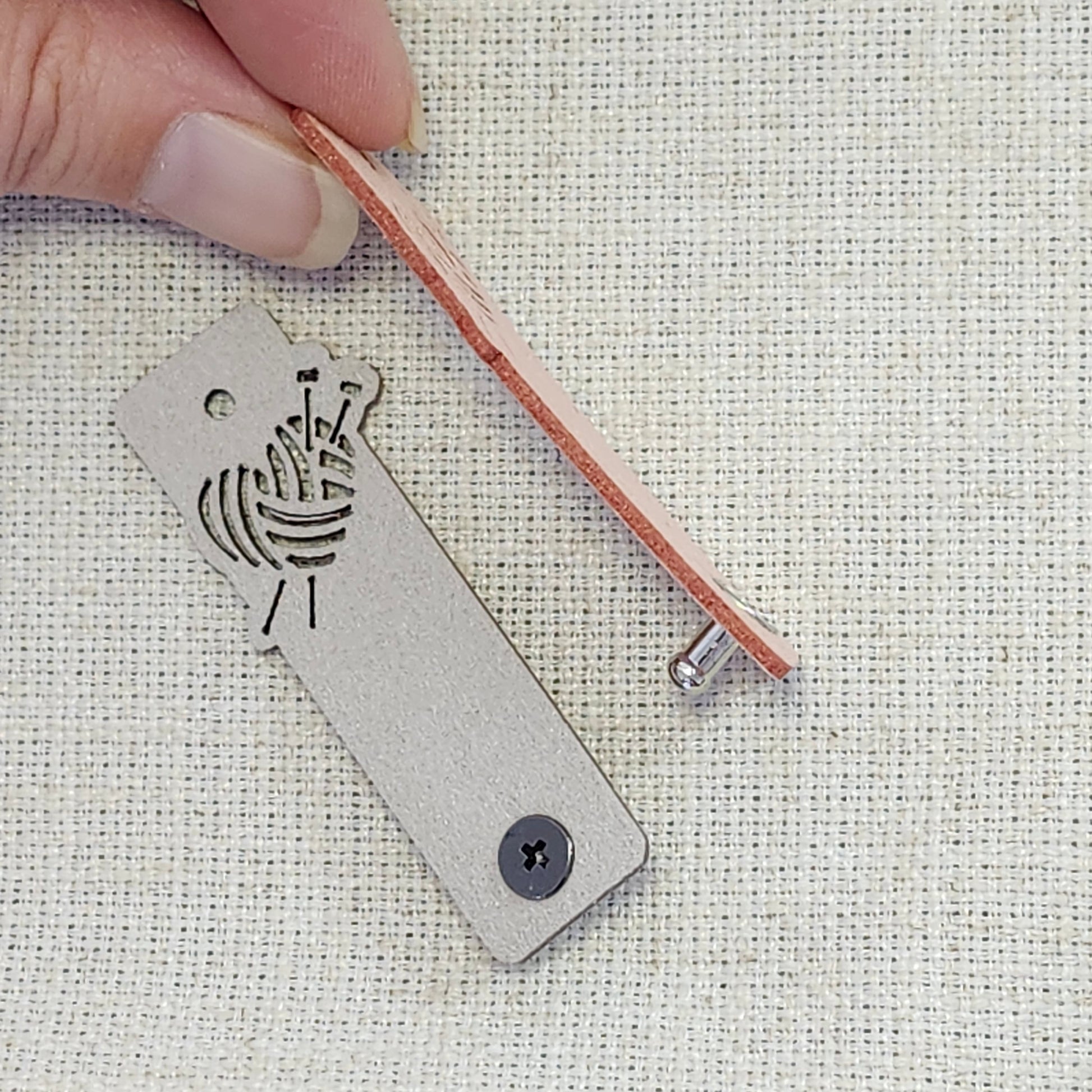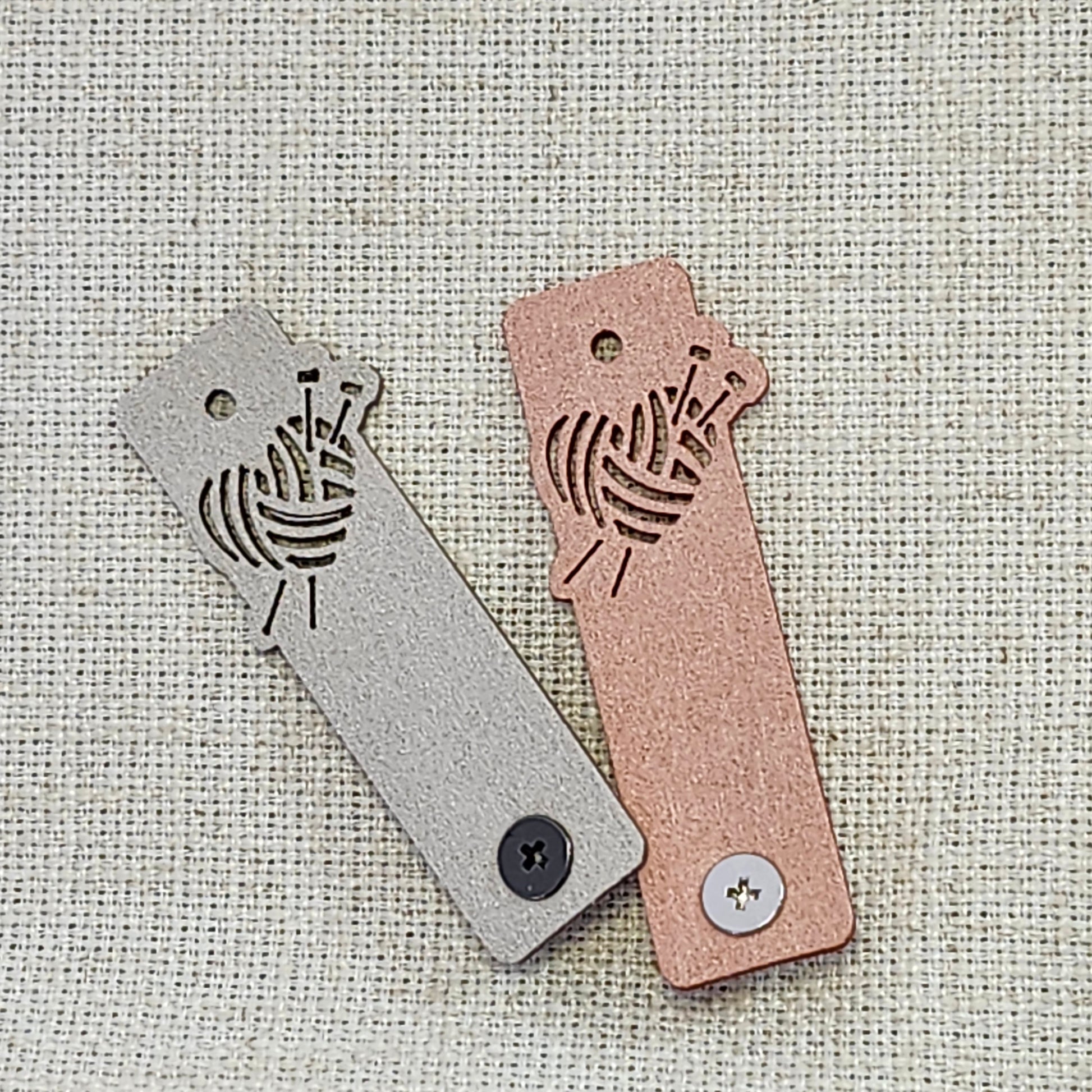 Chaque ensemble comprend deux étiquettes, une abricot et une gris pâle, ainsi que les vis de fixation incluses. Le système de vis permet une installation simple et sécuritaire, sans couture, et peut être retiré facilement sans abîmer le tricot. Les étiquettes peuvent ainsi être enlevées au besoin, notamment pour le lavage de vos projets.