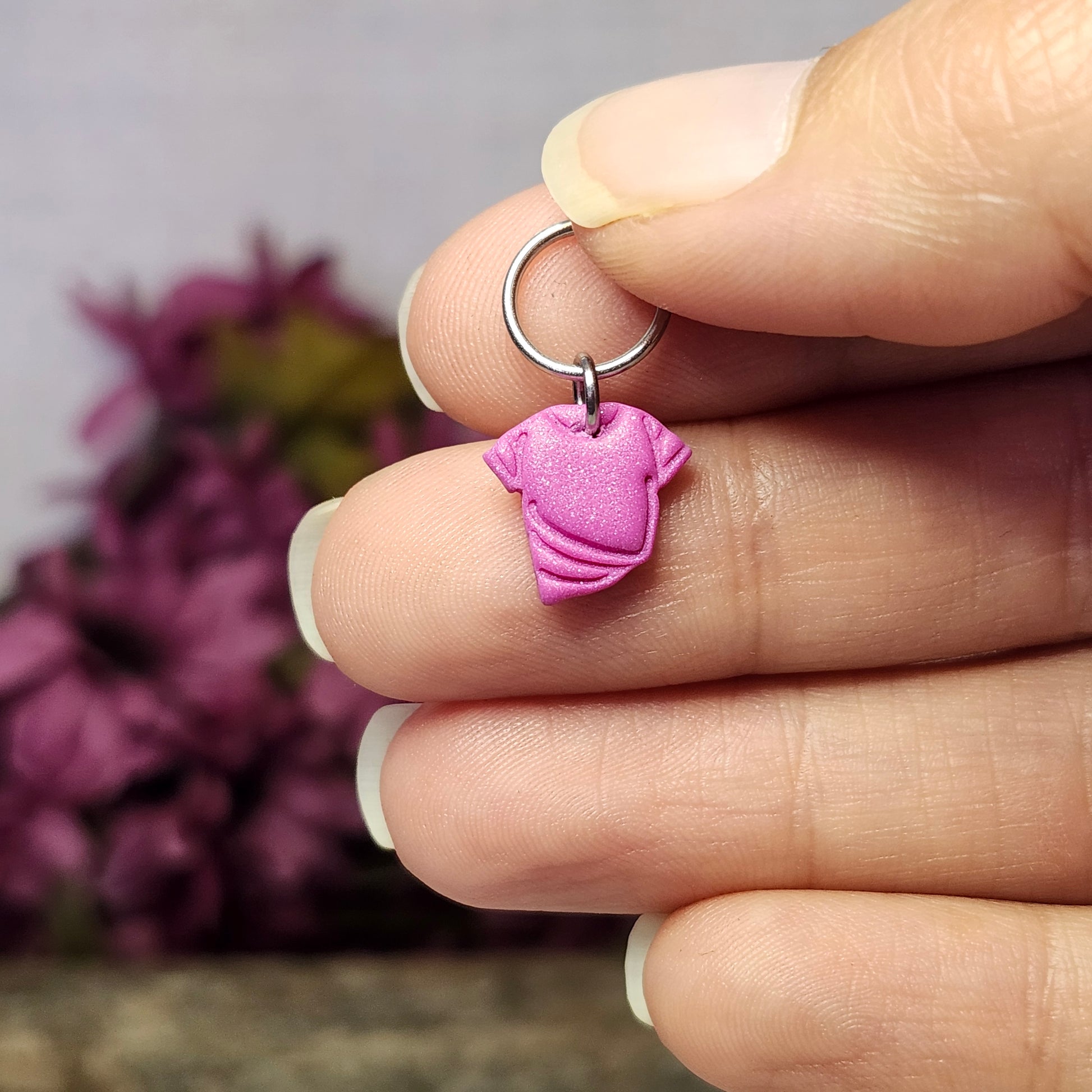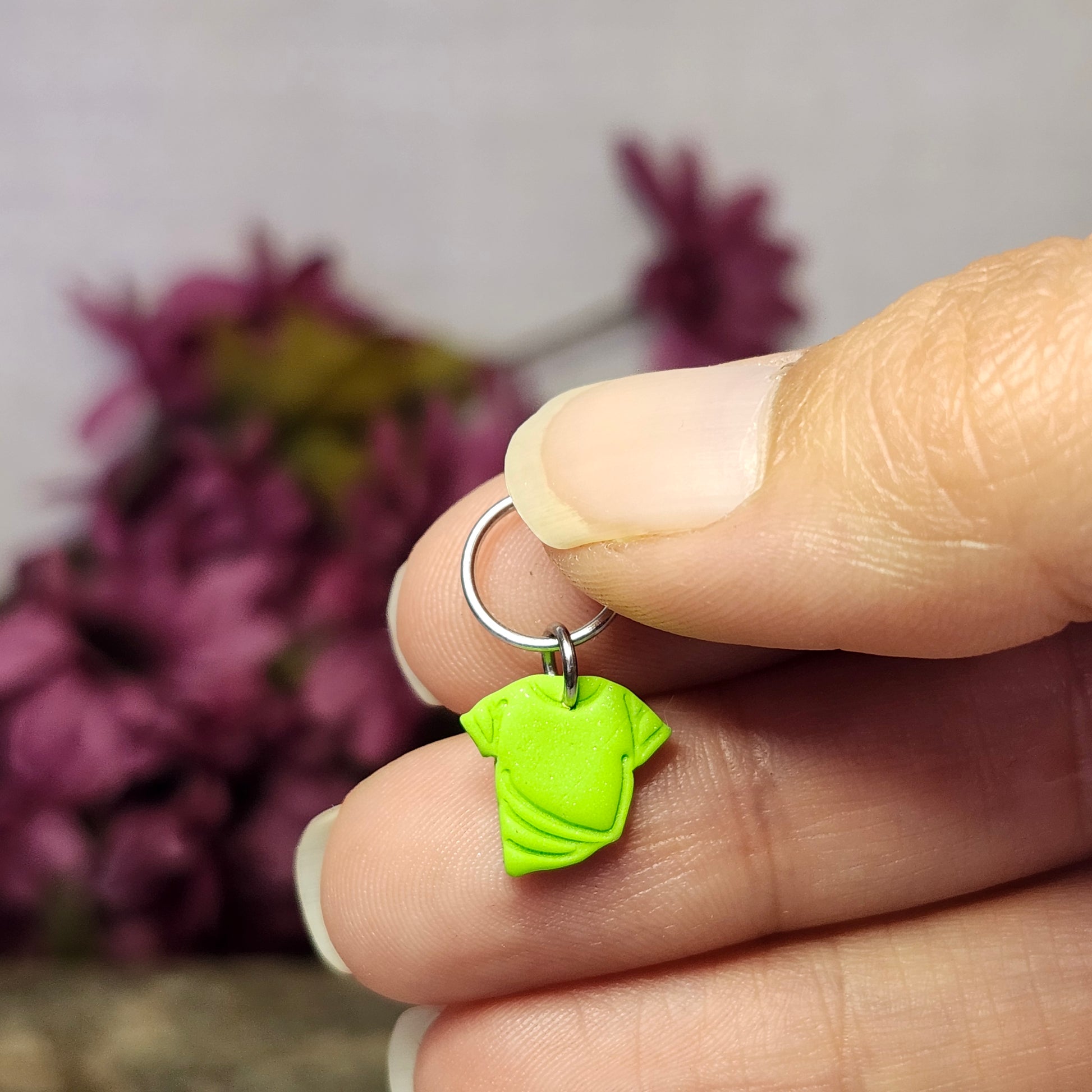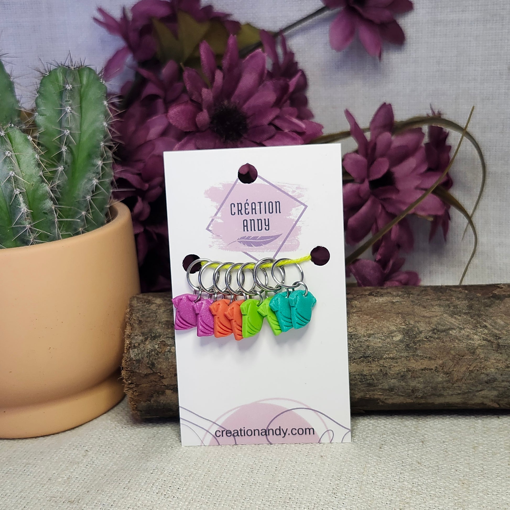 Les marqueurs sont vendus en ensemble de 8; 2 vert, 2 aqua, 2 rose et 2 orange. Ils sont assemblés sur des anneaux de 10 mm, ce qui peut convenir aux aiguilles allant jusqu’à 7 mm.
