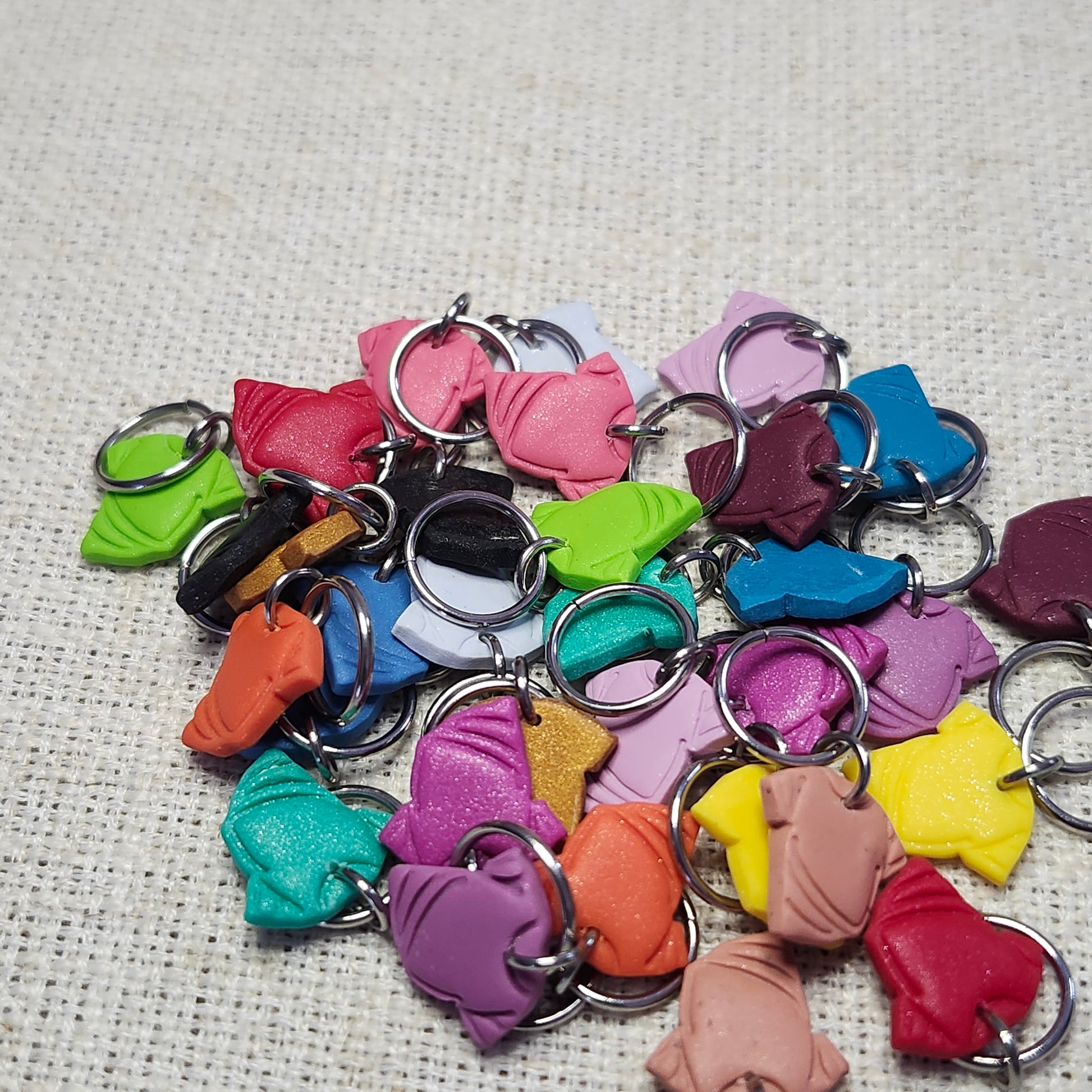 Le choix des couleurs des marqueurs amovibles peut varier. Les marqueurs amovibles (de type ampoule) peuvent être utilisés tant pour le tricot que pour le crochet. Ils s'ouvrent comme une épingle à couche, on peut donc les positionner où on le souhaite et les retirer facilement. Ils conviennent aux aiguilles allant jusqu'à 7mm (10.75US).