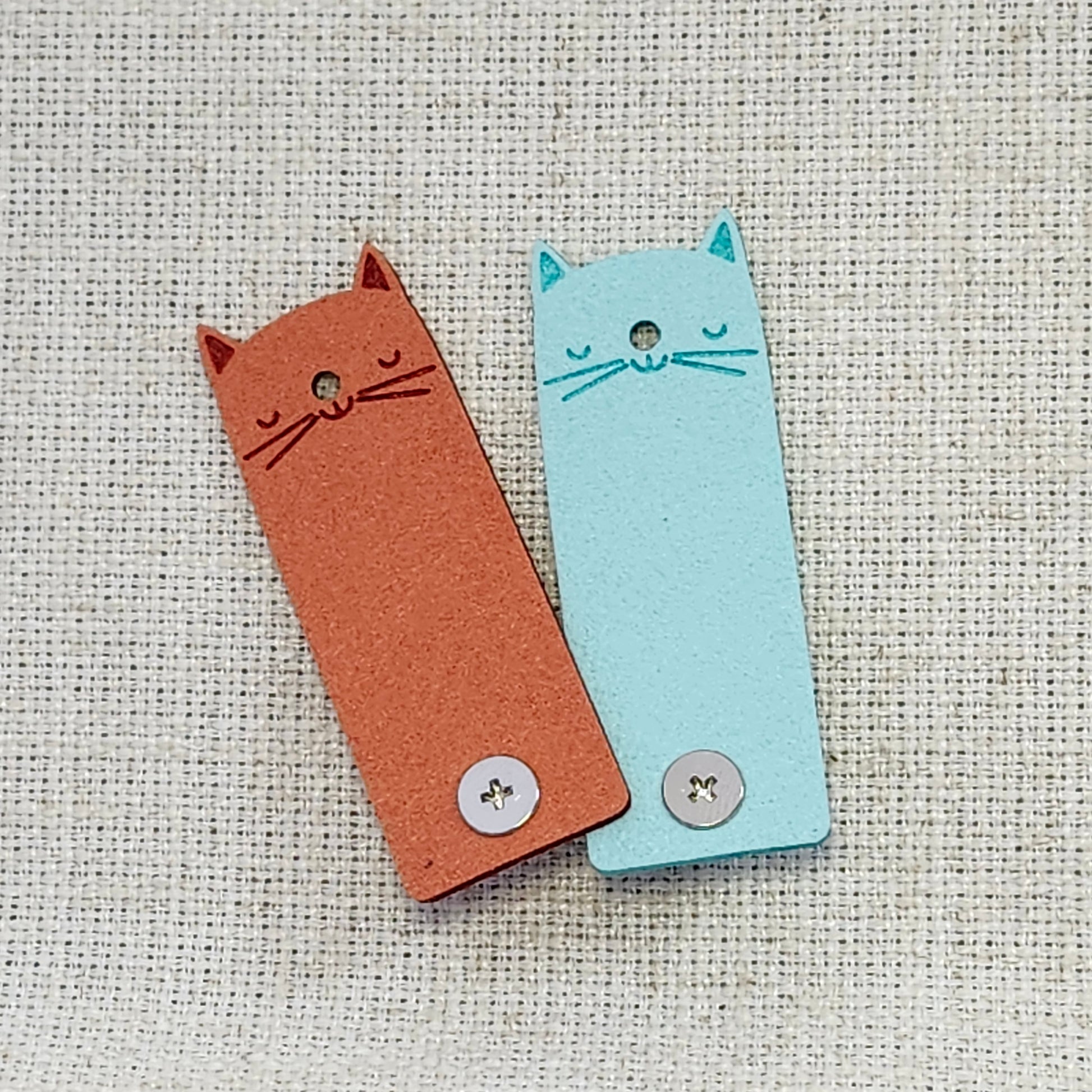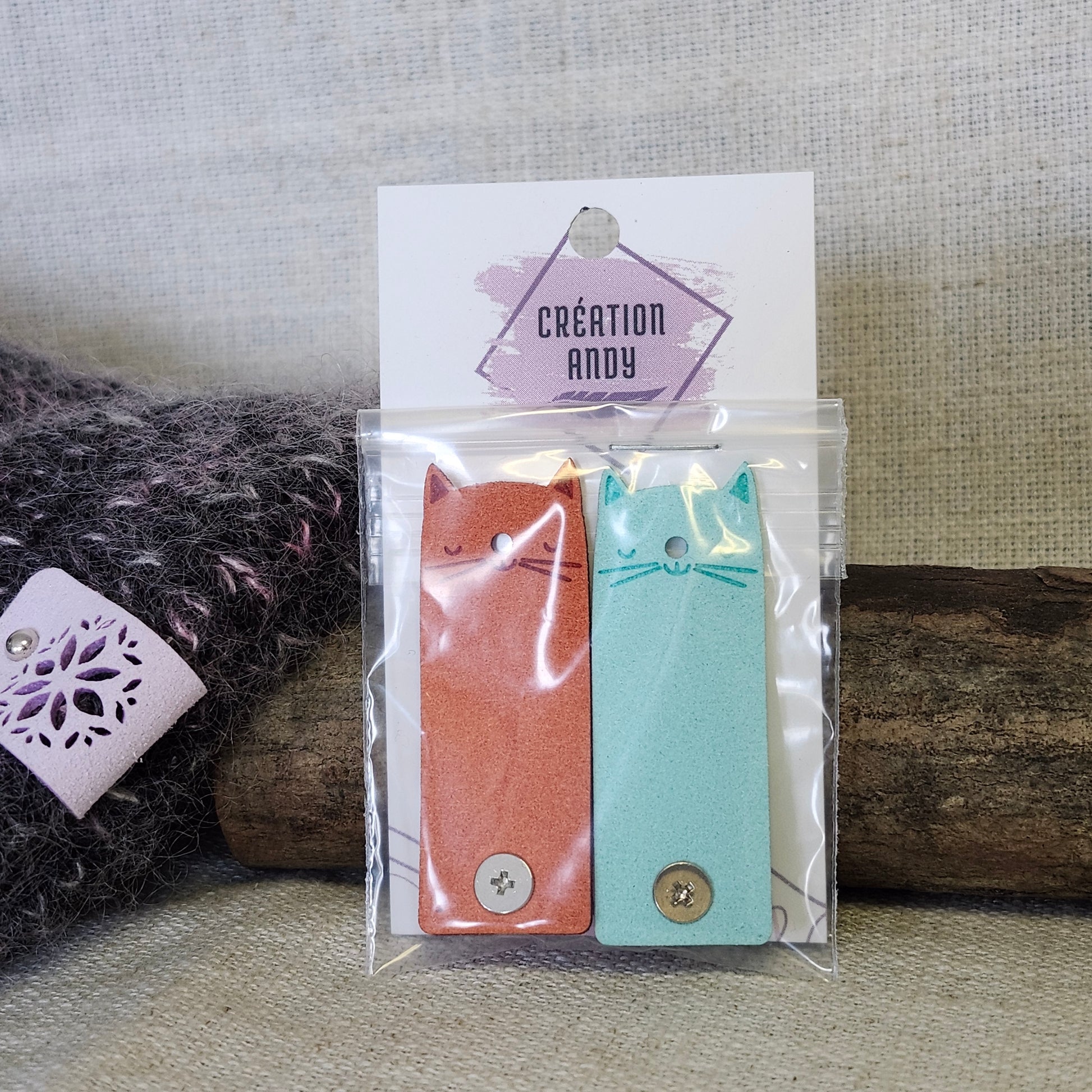 Étiquettes pour tricot en simili suède – Chat bleu et orange