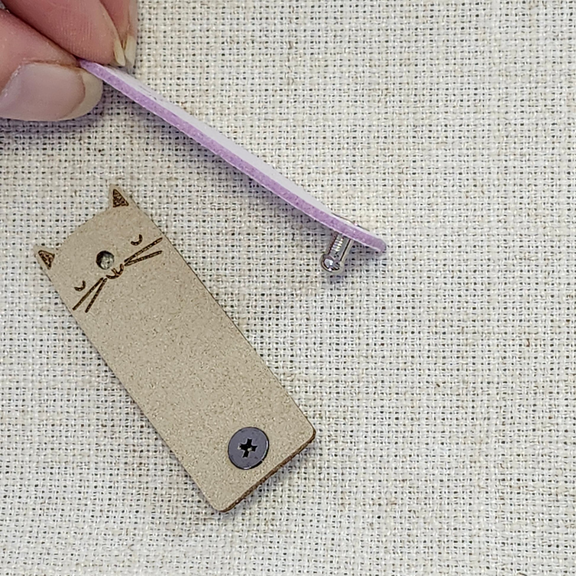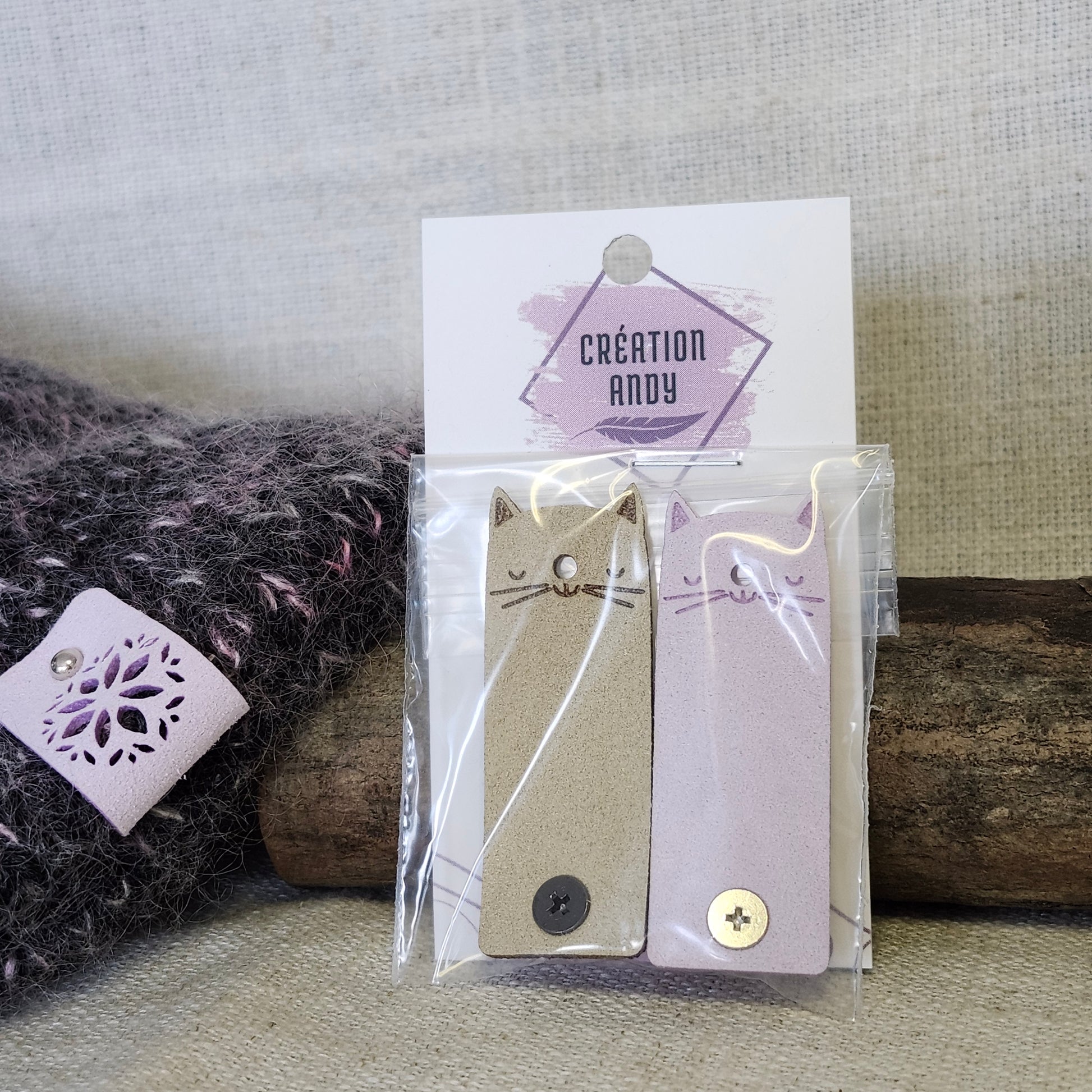 Étiquettes pour tricot en simili suède – Chat lilas et beige